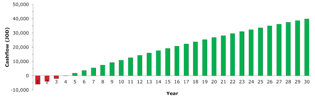 But is the Passivhaus concept viable in Jordan? Through this financial modelling exercise, we have attempted to estimate the cost premium of various design interventions required to achieve the Passivhaus standard, as well as the payback period of these measures. The results are encouraging: with an estimated construction cost premium of less than 5% (including our consultation fee), the payback period of a Passivhaus in Jordan would be approximately 6.5 years. Over a period of 15 years, the estimated cost savings can reach up to JOD 14,000. In addition to the known health and comfort benefits of Passivhaus, this exercise has shown that implementing Passivhaus in Jordan makes economic sense and could save homeowners up to JOD 35,000 over the lifetime of the house (30 years).