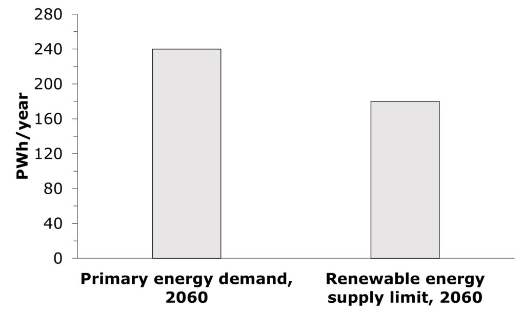 The factors limiting the supply of renewable energy range from the availability of materials to the difficulty of abating some sectors — i.e., the industry and transports sectors — and so negative emissions would have to be ‘produced’ which, in turn, is limited by the amount of land available for both bioenergy carbon capture and storage (CCS) and food production. For instance, it is estimated that, should our annual growth in energy demand persist, supplying that demand through renewable energy sources would require 140% and 180% of cobalt’s and lithium’s current proven reserves (respectively) [3].
